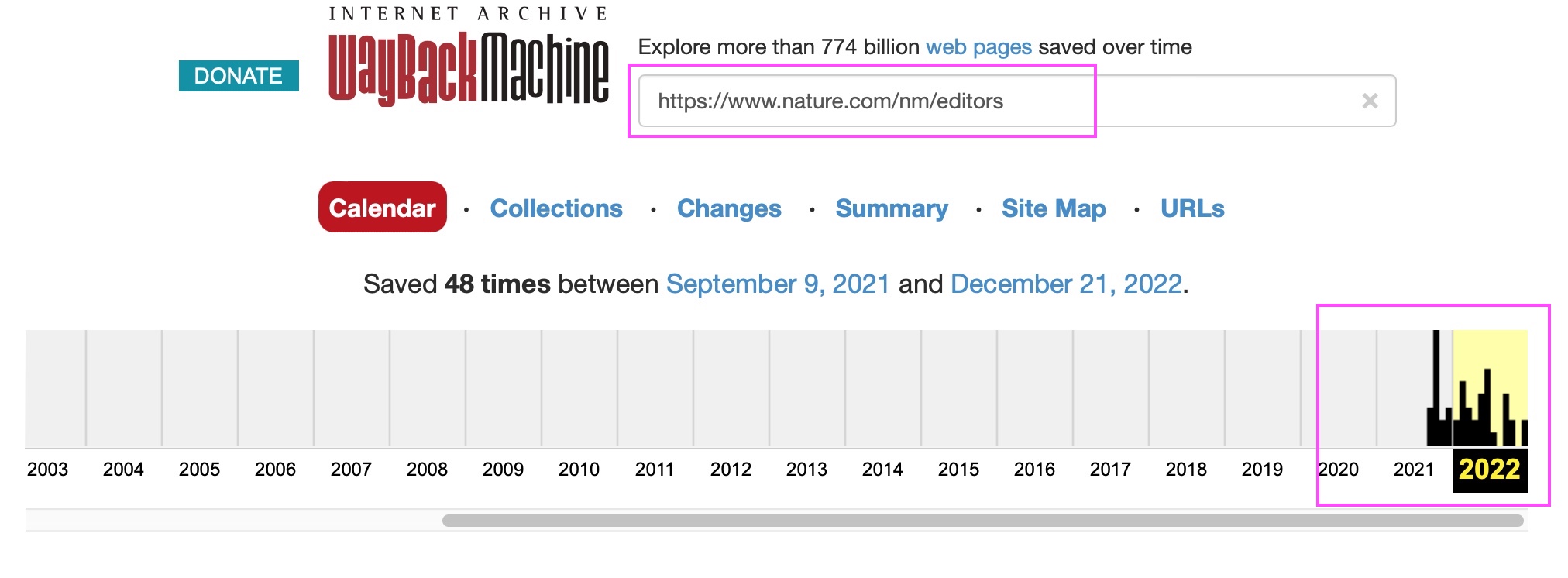 用时光机检索nature medicine的历任主编时,发现主编页面只保存了近两年的快照,无法检索到创刊主编是谁。