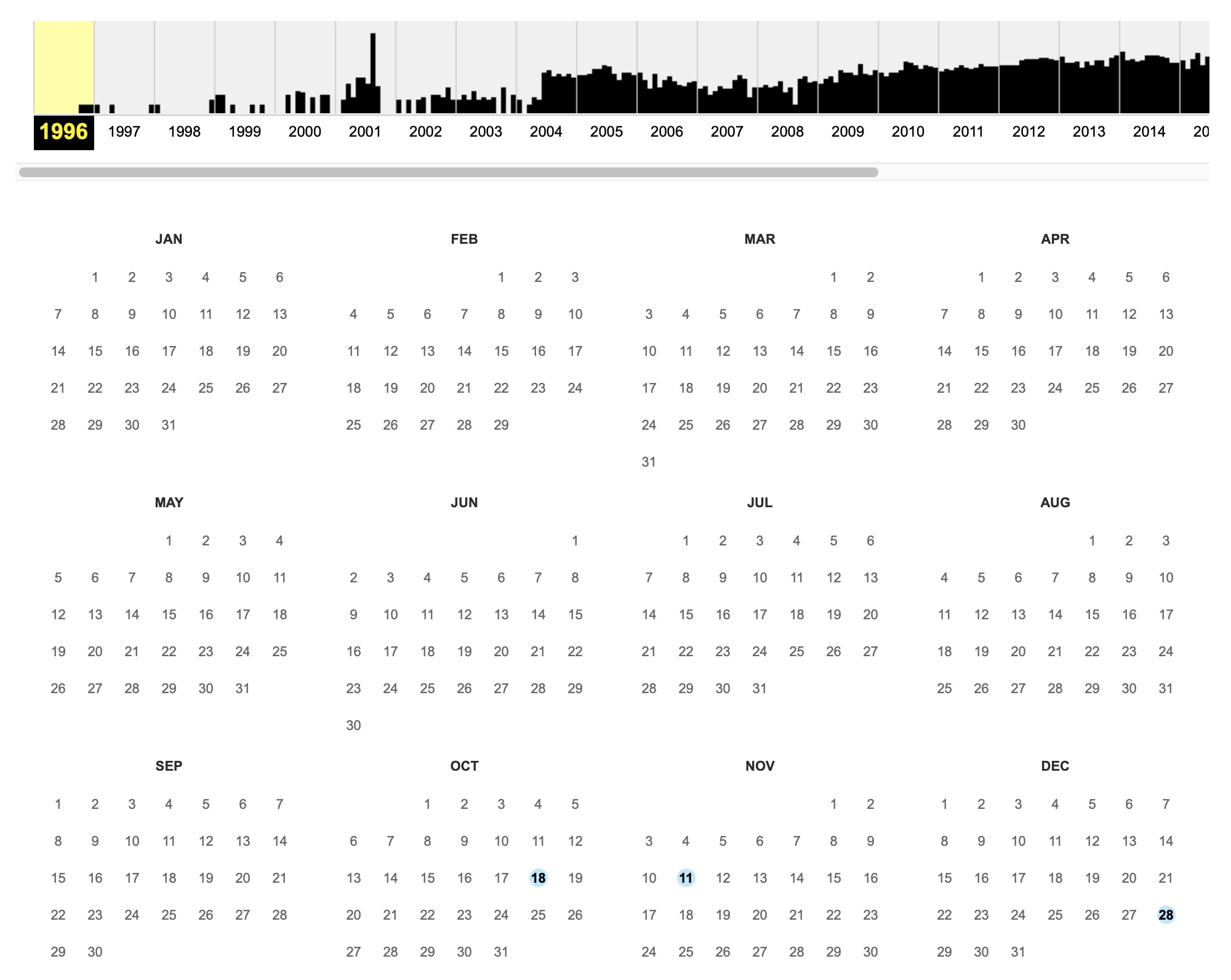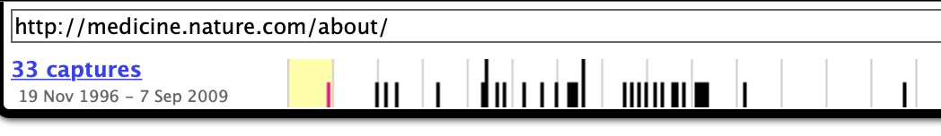 我们发现这个页面的网址是http://medicine.nature.com/about/,且时间信息包含了1996-2009年,接着点击不同时间的黑色竖条,可以快速跳转到当年的快照。