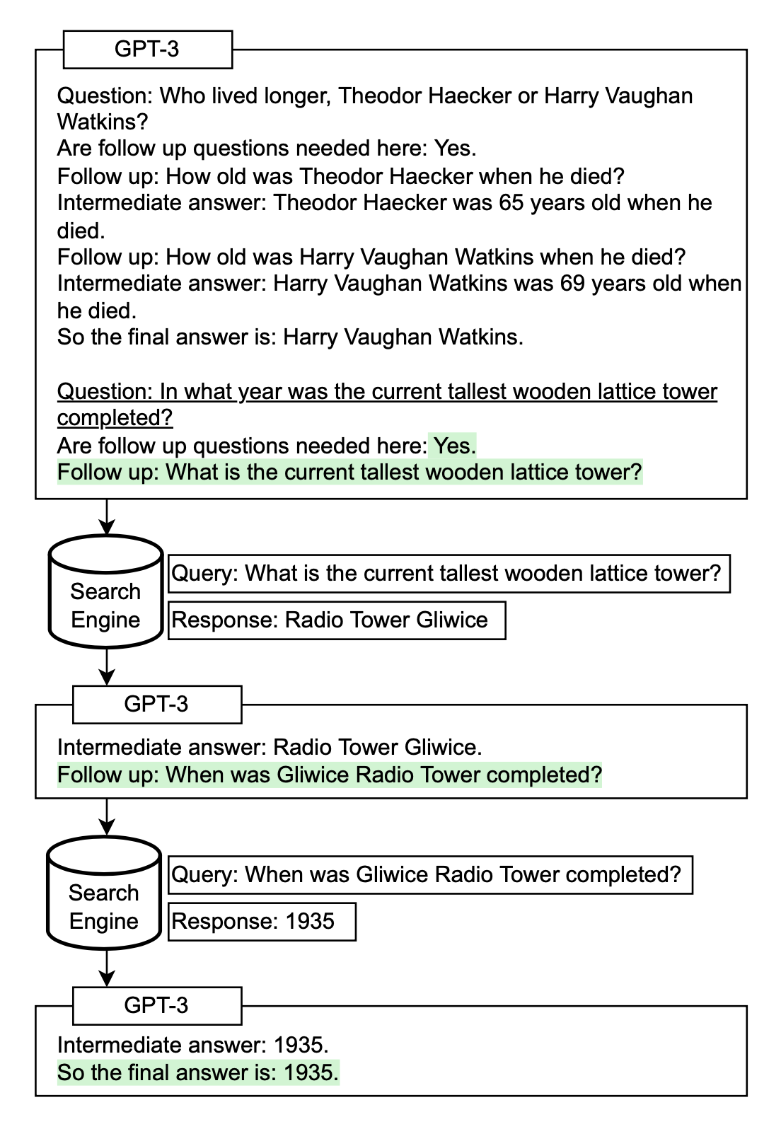 图 1. Self-Ask 如何与外部搜索查询一起工作。 (图片来源:Press et al. 2022 )。