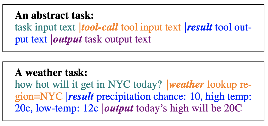 )是一个通过文本到文本API调用增强的语言模型。LM会在任务输入文本的条件下生成|tool-call和tool input text来构造API调用请求。当|result出现时,会调用指定的工具API,并将返回的结果追加到文本序列中。最终的输出在|output标记之后生成。