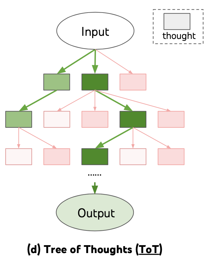- 思维之树 (Yao et al. 2023 ) 通过在每一步探索多种推理可能性来扩展CoT。它首先将问题分解为多个思维步骤,并在每个步骤生成多个思维,从本质上创建一个树结构。搜索过程可以是BFS或DFS,而每个状态都由一个分类器(通过提示)或多数票评估。