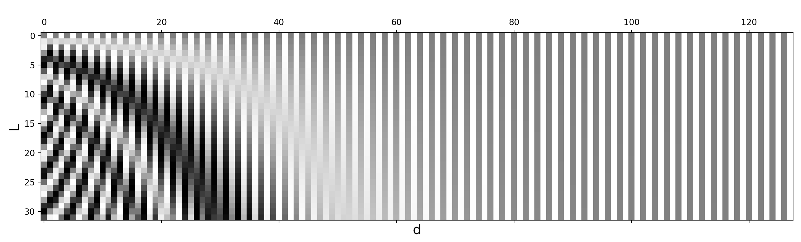 图 3. 具有 $L=32$ 和 $d=128$ 的正弦位置编码。值在 -1(黑色)和 1(白色)之间,0 值为灰色。