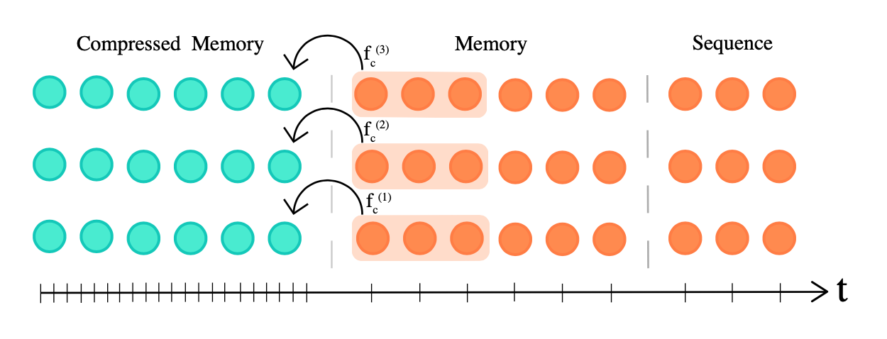 记忆和压缩记忆都是 FIFO 队列。给定模型上下文长度 $L$,压缩函数的压缩率为 $c$ 定义为 $f_c: \mathbb{R}^{L \times d} \to \mathbb{R}^{[\frac{L}{c}] \times d}$,将 $L$ 个最旧的激活映射到 $[\frac{L}{c}]$ 压缩内存元素。有多种压缩函数选择: