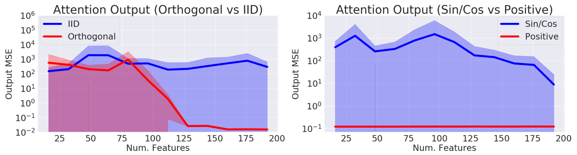 图24. 使用 (左) i.i.d 与正交特征和 (右) sin/cos 与正随机特征时的近似误差比较。(图片来源: Choromanski et al. 2021 )。