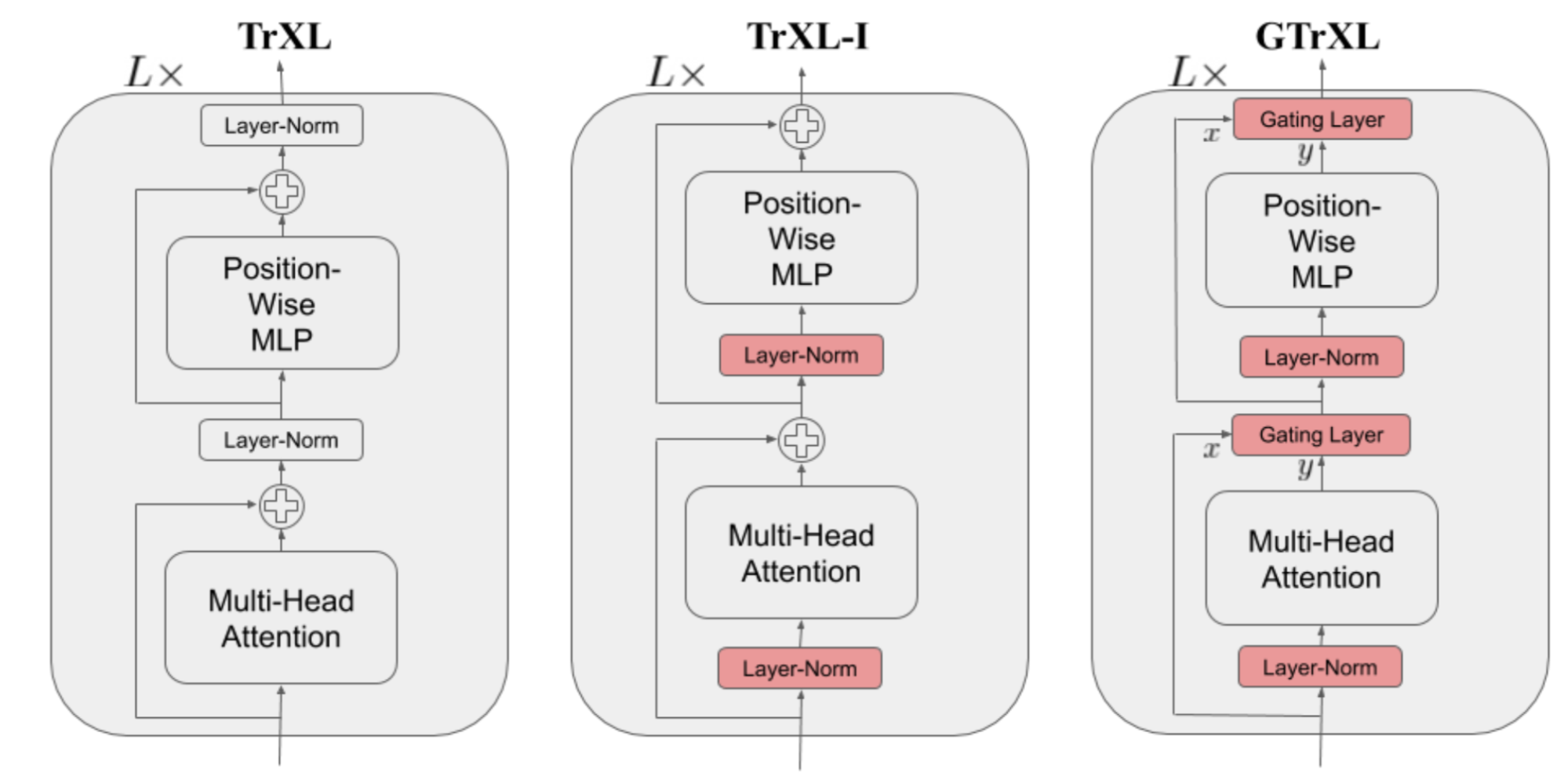 Gated Transformer-XL (GTrXL; Parisotto, et al. 2019 ) 是一种尝试使用Transformer进行RL的方法。在Transformer-XL 的基础上,GTrXL 通过两个改变成功地稳定了训练: