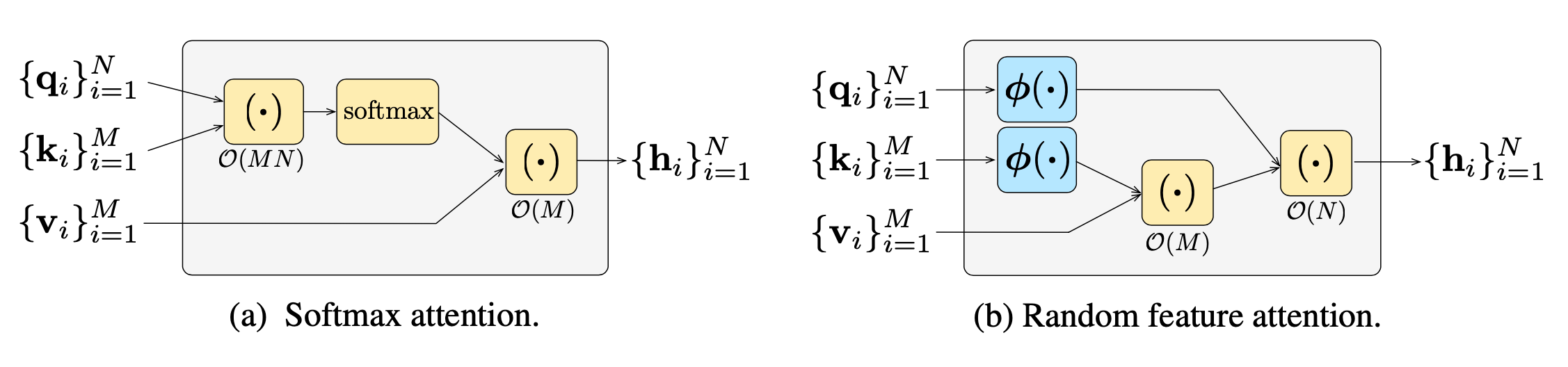 $$ \begin{aligned} \text{attn}(\mathbf{q}_t, \{\mathbf{k}_i\}, \{\mathbf{v}_i\}) &= \sum_i \frac{\exp(\mathbf{q}_t\cdot\mathbf{k}_i/\sigma^2)}{\sum_j \exp(\mathbf{q}_t\cdot\mathbf{k}_j/\sigma^2)}\mathbf{v}_i^\top \approx \sum_i \frac{\phi(\mathbf{q}_t)\phi(\mathbf{k}_i)\mathbf{v}_i^\top}{\sum_j \phi(\mathbf{q}_t)\phi(\mathbf{k}_j)} \\ &= \color{green}{\frac{\phi(\mathbf{q}_t)^\top \sum_i \phi(\mathbf{k}_i)\otimes\mathbf{v}_i}{\phi(\mathbf{q}_t)^\top \sum_j \phi(\mathbf{k}_j)} = \text{RFA}(\mathbf{q}_t, \{\mathbf{k}_i\}, \{\mathbf{v}_i\})} \end{aligned} $$